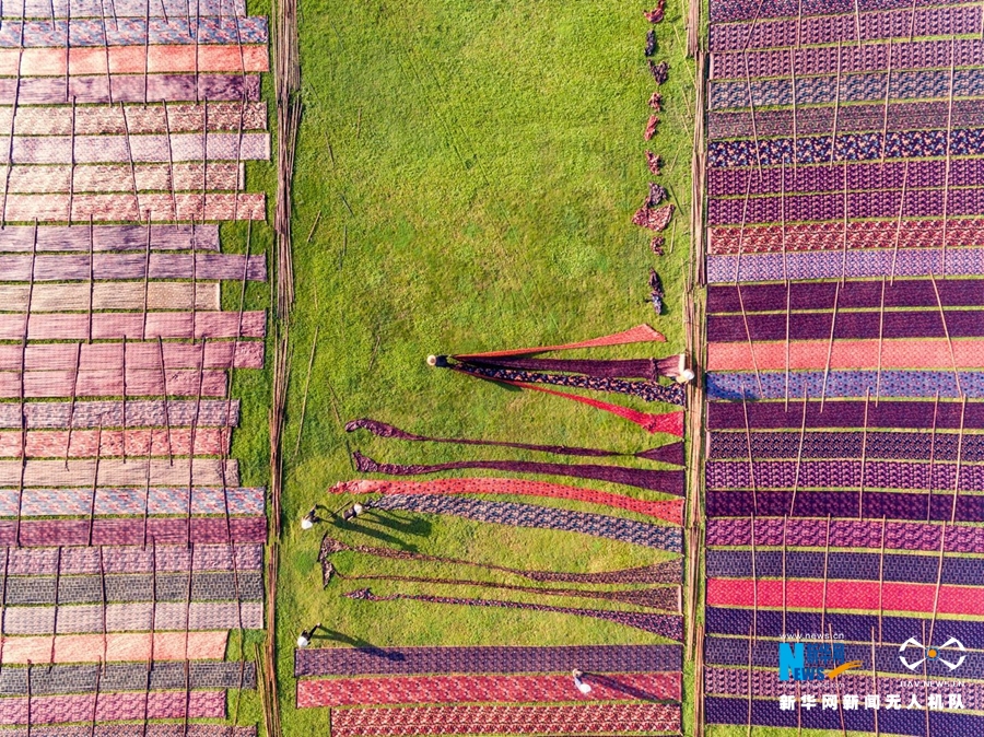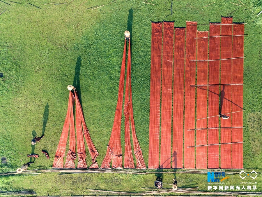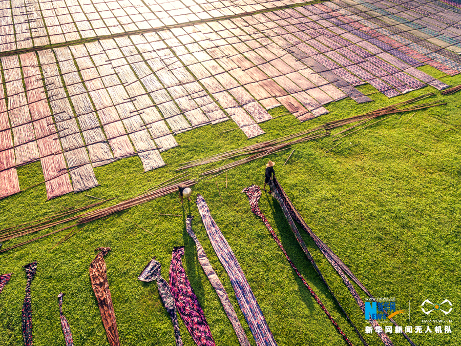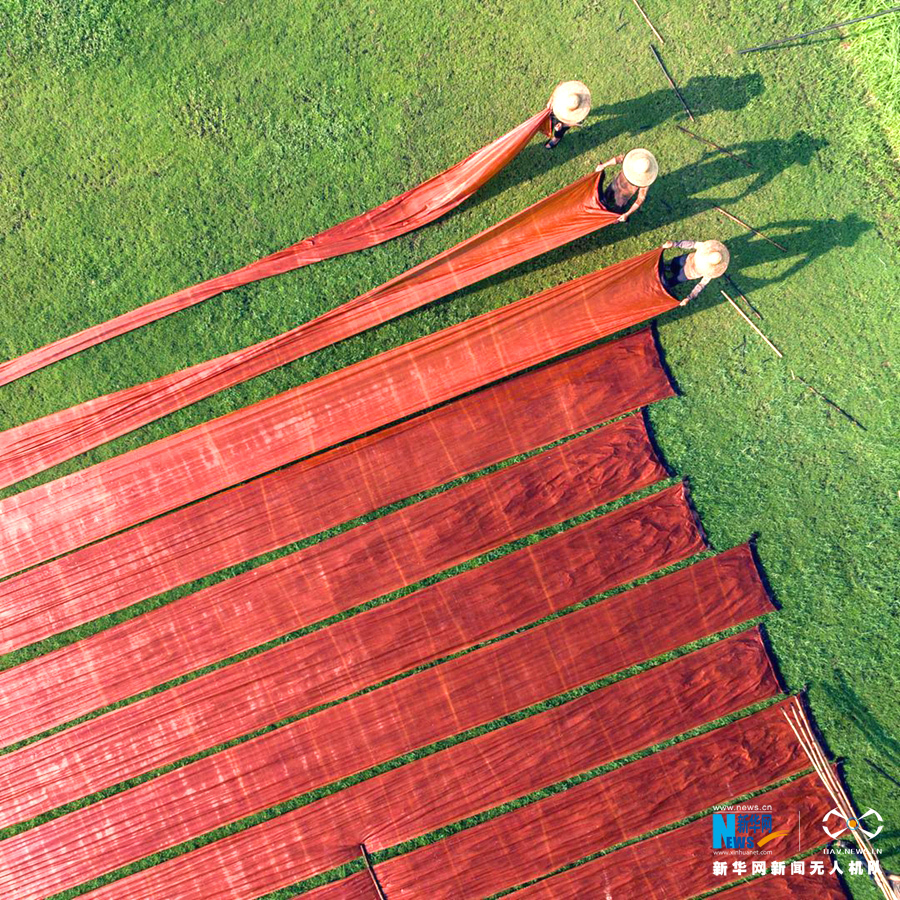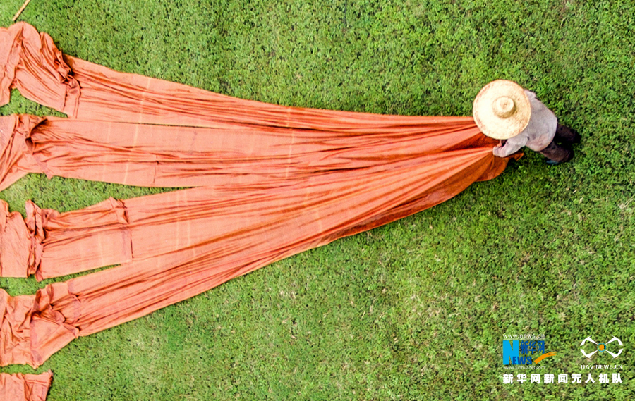 染上颜色的香云纱整齐排列在草地上,仿若辛勤匠人为大地披上的“彩霞”。
