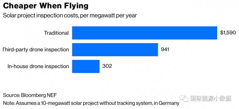 同样,目前光伏电站以常规方式检测,光伏电站成本为1,590元/兆瓦。租用第三方的无人机成本可降为941美元;如果是自有无人机,那么成本降为302美元。