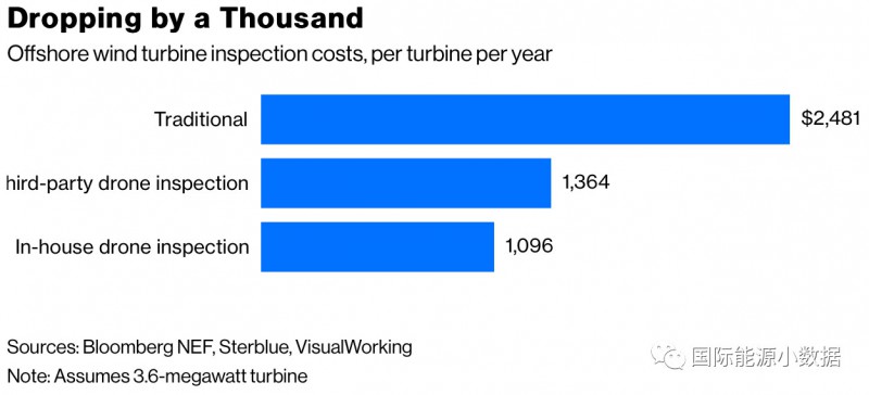 目前,以常规的方式进行海上风电机组的检测,那么每台风机每年成本为2,481美元(以3.6兆瓦风机为基准)。如果使用无人机来检测,成本会是多少呢?根据彭博新能源财经的估算,租用第三方的无人机成本可降为1,364美元;如果是自有无人机,那么成本降为1,096美元。使用无人机对海上风电检测,相当于海上风电成本可降低1%。
