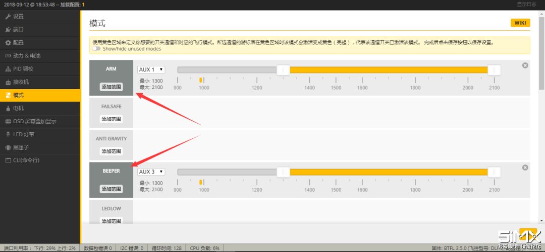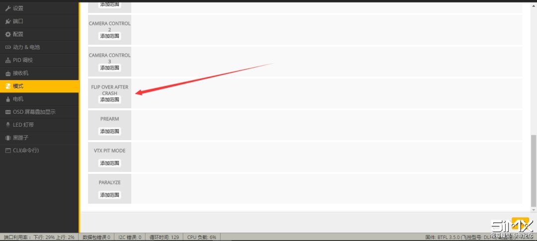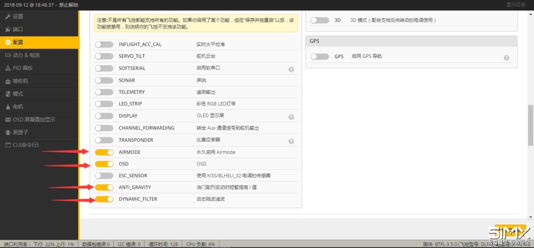 这些功能大家可以根据自己的实际情况来选择,尽量关掉自己不用的功能来减少CPU的占用,我这里只开了AirMode,OSD,反重力和动态滤波,3.5.1固件的滤波很厉害,一定要尝试一下,当然很多老司机也不需要这些功能,一切全靠手法,这里就要大家按照自己的需求来配置啦!