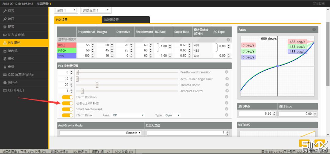进入PID界面,这个就因人而异了,不同的飞机,不同飞手的个人习惯都有很大的区别,在经仅做参考,现在的固件默认PID就已经很好飞了,值得一提的是油门增压和电池电压PID补偿很实用,会有种小哥哥上天吗的感觉,推背感十足!
