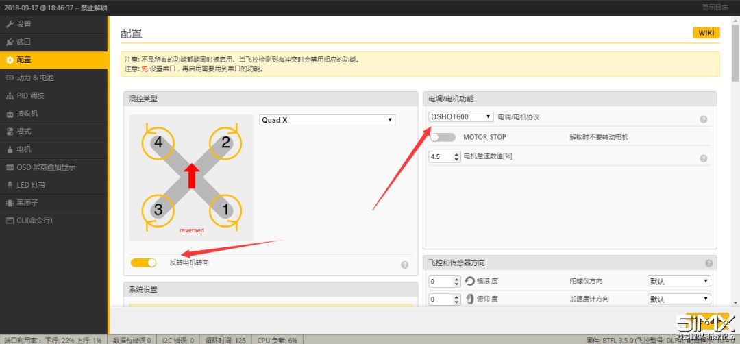 下面来到配置页,首先我的螺旋桨是反转安装,点击反转电机转向按钮,这样的好处是在低空割草的时候,被螺旋桨带起的草汁和灰尘等会全部打在飞机侧面而不会弄脏摄像头,尤其搭配在神龟机架等有外壳的机架上非常实用。