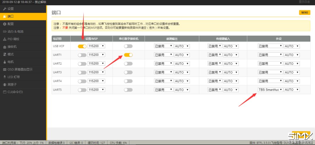 先到端口页,打开接收机对应的串口,以及外接设备,如黑羊图传的TBS Smart Audio等,并记得每一步都要点击保存。