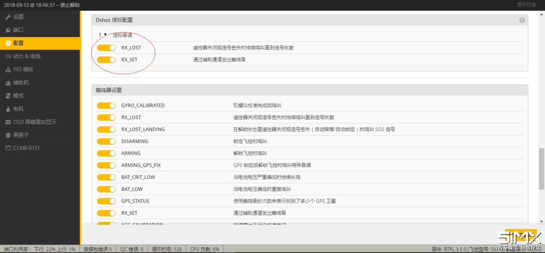 还有就是有些小盆友问到我是怎样让电调BB响的,以前的老固件需要用CLI命令,现在的新固件越来越方便了,直接打开下面红圈里的开关,然后保存就OK。