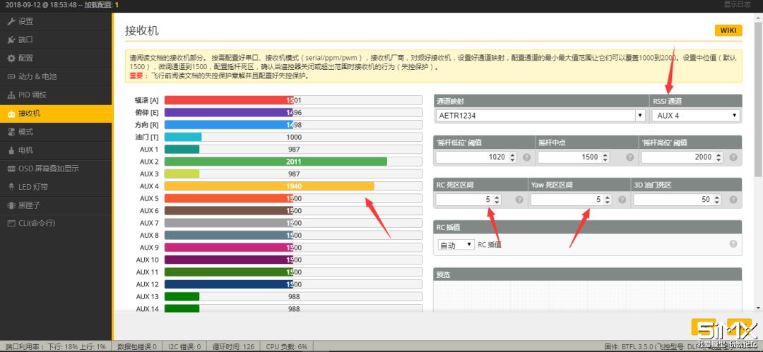 接收机界面,要保证各个通道对应的摇杆值都为最低1000,中值1500,最高2000,如果摇杆中位的时候数值跳动,可以适当加大死区来消除跳动,这里我用了AUX4来回传RSSI强度,这样就可以在OSD中看见回传信号强度啦!