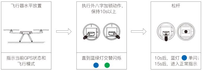 步骤 2. 在遥控器上执行外八字加锁动作,保持 10 秒以上,直到状态指示灯蓝绿灯开始交替闪烁。