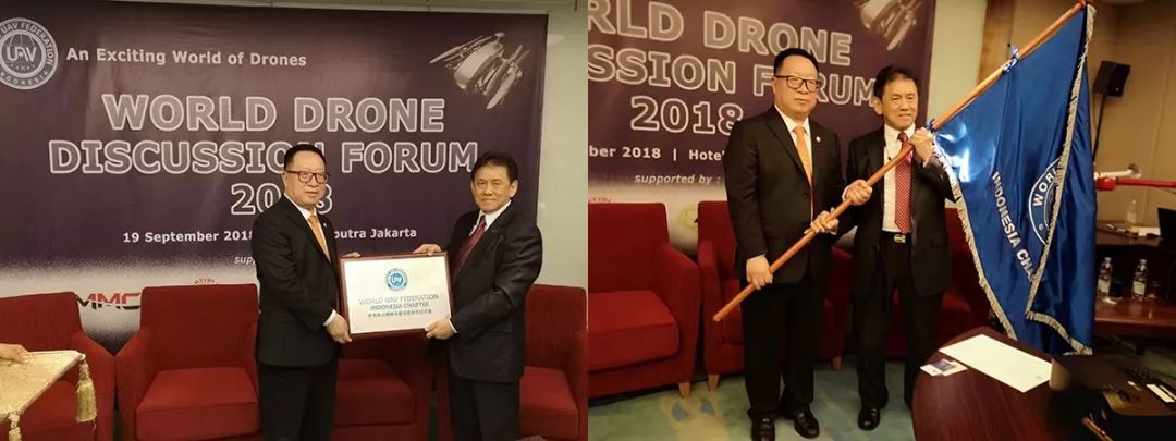 同时,世界无人机联合会印尼分会在研讨会上正式宣告成立,印尼警察副总长被聘为分会顾问。深圳市无人机协会会长杨金才代表世界无人机联合会(WUAVF)为印尼分会颁授会旗和分会牌匾。