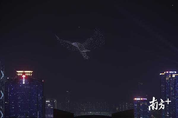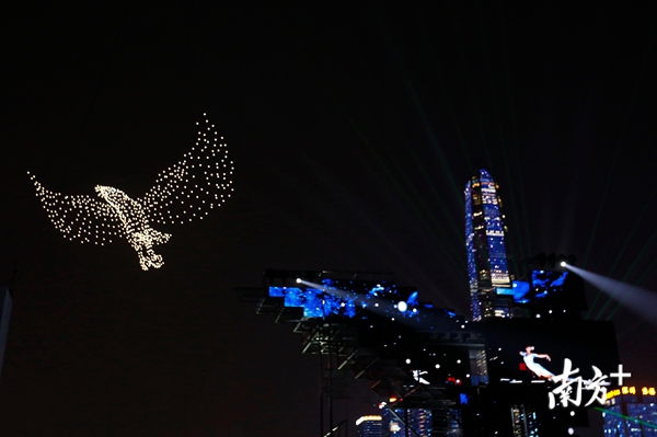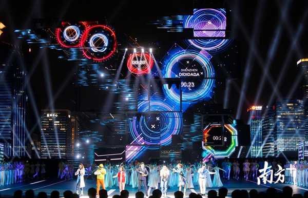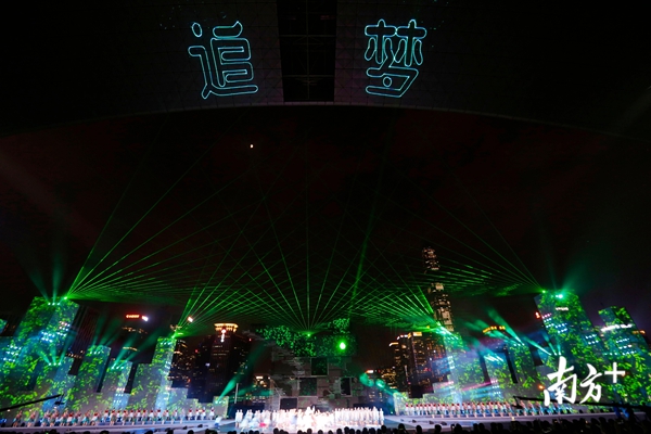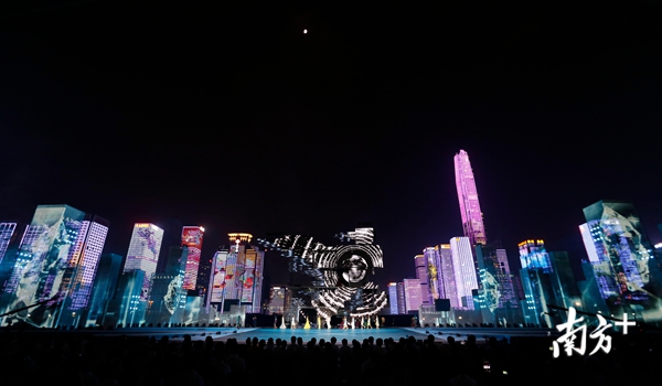 当晚,莲花山下市民中心广场流光溢彩,舞台中央,树立着绚丽的“追梦人”形象,由高16米、宽21米的巨大钢架和数十块屏幕组成。