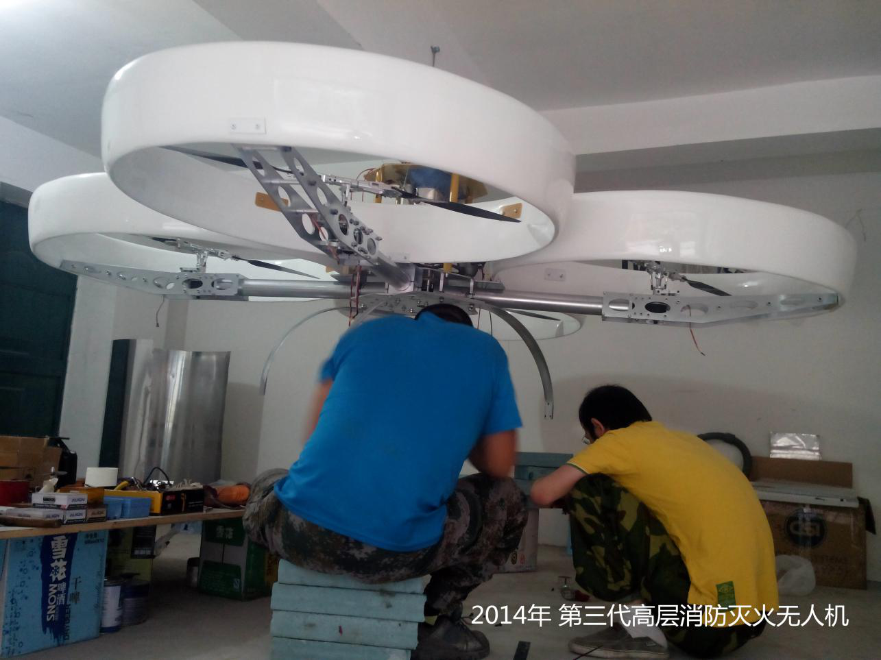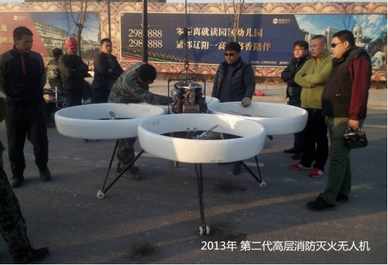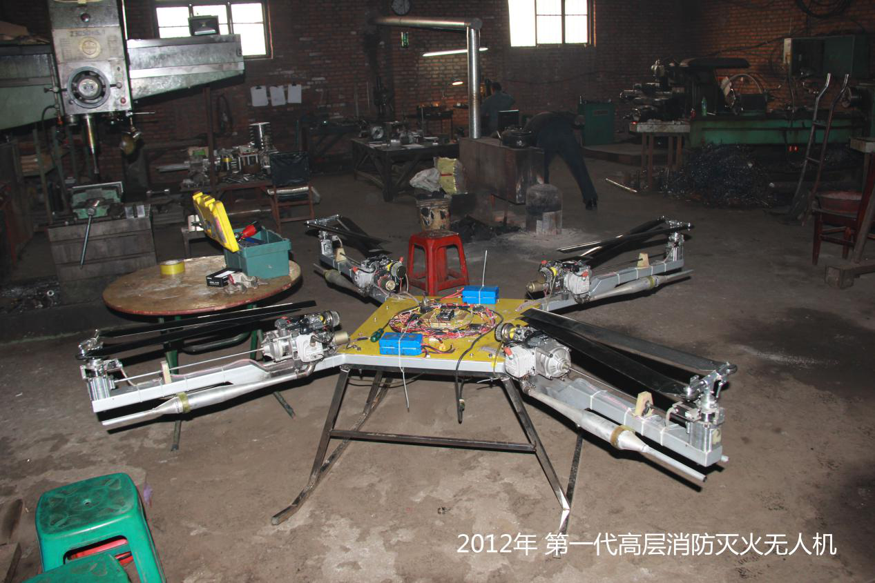 研发团队自2013年开始,已成功研发出全国最大以燃油为动力变距多旋翼无人机,载荷可达30--100公斤,续航时间可达2--6小时。目前与公安部天津消防研究所及重庆长安军工集团合作,已研发出中国首款高层消防电动无人机,载荷25公斤,续航时间达35分钟。该款电动高层灭火无人机从起飞到扑灭100米的高层火灾仅用一分钟,灭火面积可达100立方米,高层消防无人机的研发成功,解决了行业的痛点,填补了世界空白,它将改变消防历史让高层消防不在成为世界难题。该项目已获得各级政府高度重视和消防部门的认可。消防灭火无人机有4款机型,主要用于高层消防灭火、森林灭火、高层消防预警和森林火灾预警。