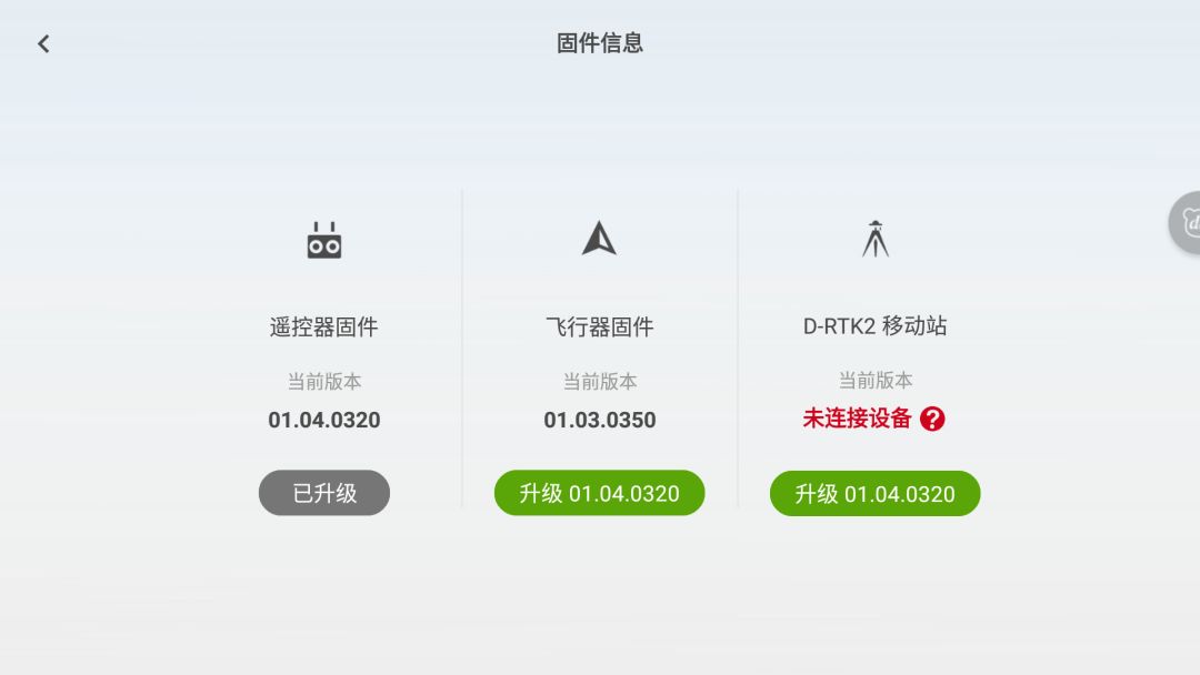 3) 下载完成后,会显示遥控器固件版本号和飞行器固件版本号(需使用数据线连接遥控器和飞行器),页面会有相应的“升级”按钮,根据实际情况点击对应的“升级”按钮操作升级 (以升级飞行器固件为例,遥控器固件升级和 D-RTK2 固件升级与之类似);