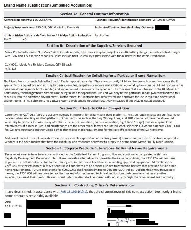这一份采购文件公布在美国联邦商业机会(Federal Business Opportunities)网站上,该网站为美国联邦政府机构公开购买项目的平台。文件说明了美国空军正寻求购买一种新型小型无人机,以及选择大疆Mavic Pro铂金版的理由。
