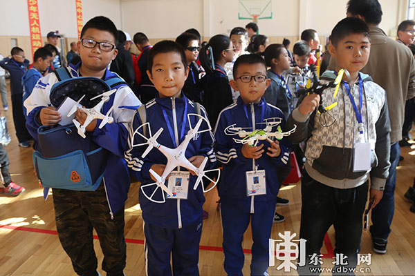 哈尔滨市和平小学的学生们正展示他们的无人机。