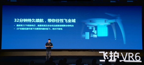 VR6 Pro的电池采用了最新款2170规格电芯,可让机器在环境更为复杂条件下正常工作。在零下20度的超低温环境下,VR6 Pro也可实现无预热起飞。飞拍官方发布的信息显示,VR6 Pro的续航时间为32分钟,这一参数比大疆最新发布的旗舰无人Mavic 2还多一分钟,是目前市售消费无人机市场续航最高的产品。