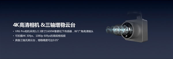 据介绍,飞拍VR6 Pro配备了一枚1/2.3英寸,有着86° F/2.0大光圈、1600W像素的松下摄像头,最高支持4K分辨率拍摄,并配备三轴无刷云台,输出平稳顺畅。