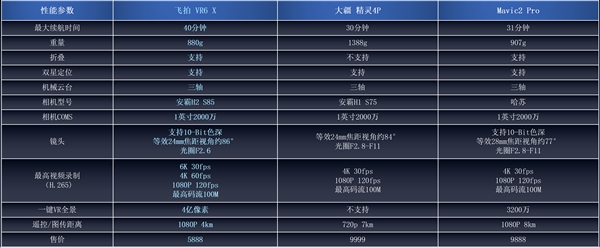 飞拍VR6 X 对比大疆精灵4P、Mavic2 Pro参数