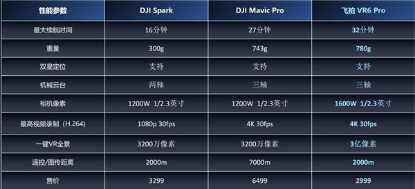 飞拍VR6 PRO 对比大疆Spark、Mavic参数