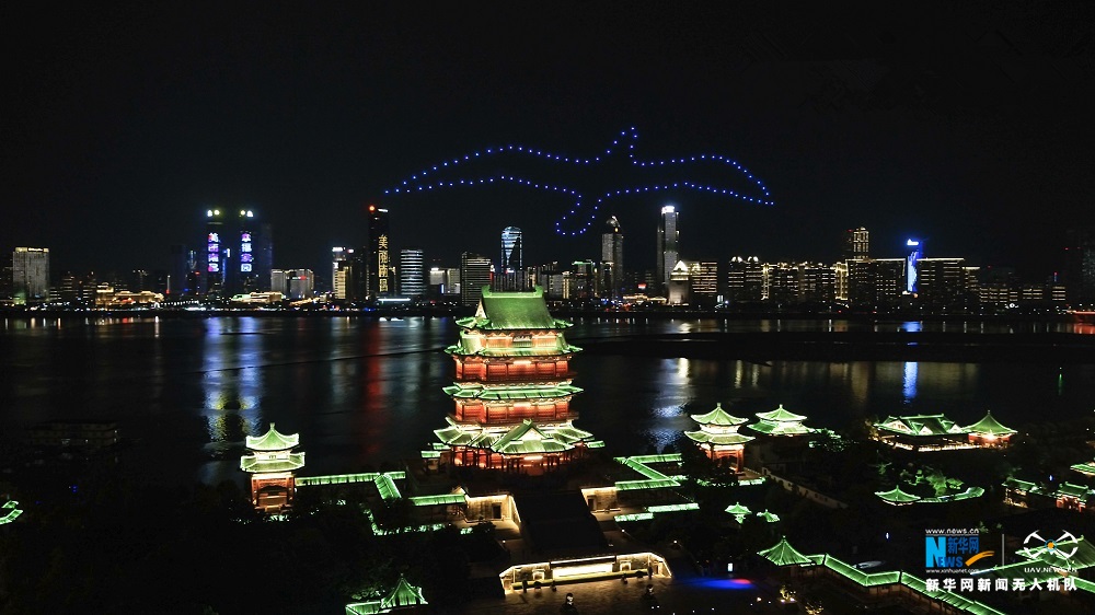 9月25日,“落霞与孤鹜齐飞”,由无人机组成的“孤鹜”展翅于赣江之上。