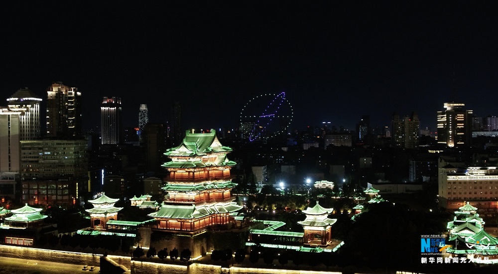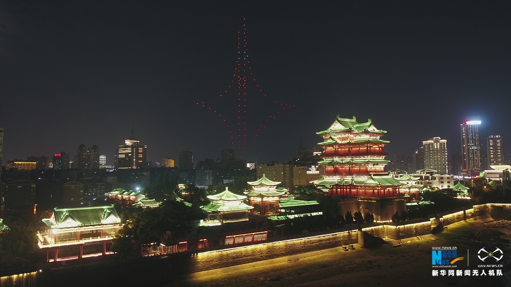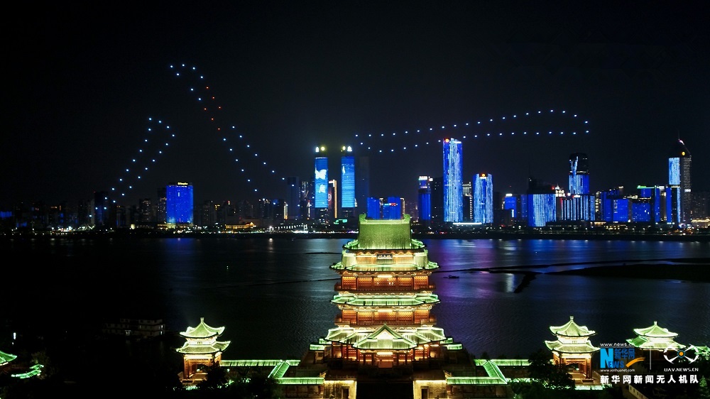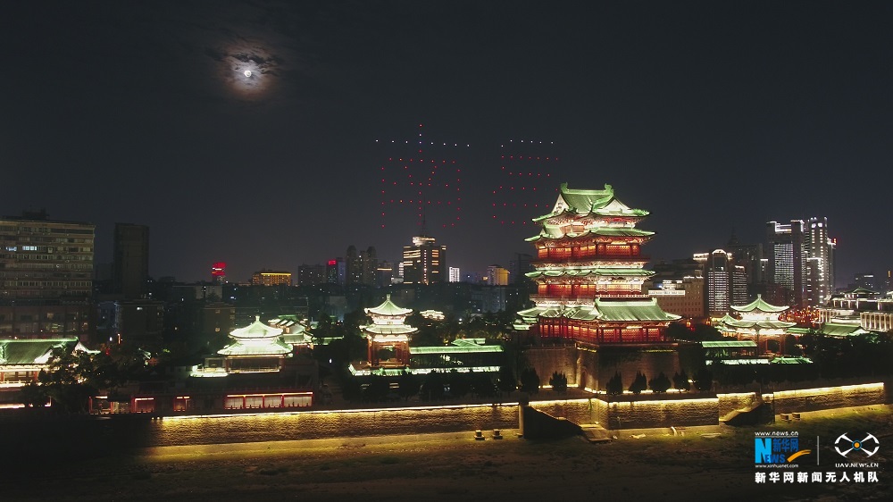 9月25日,百架携带LED灯的无人机组成的“南昌”字样与夜空上的圆月相映成辉。