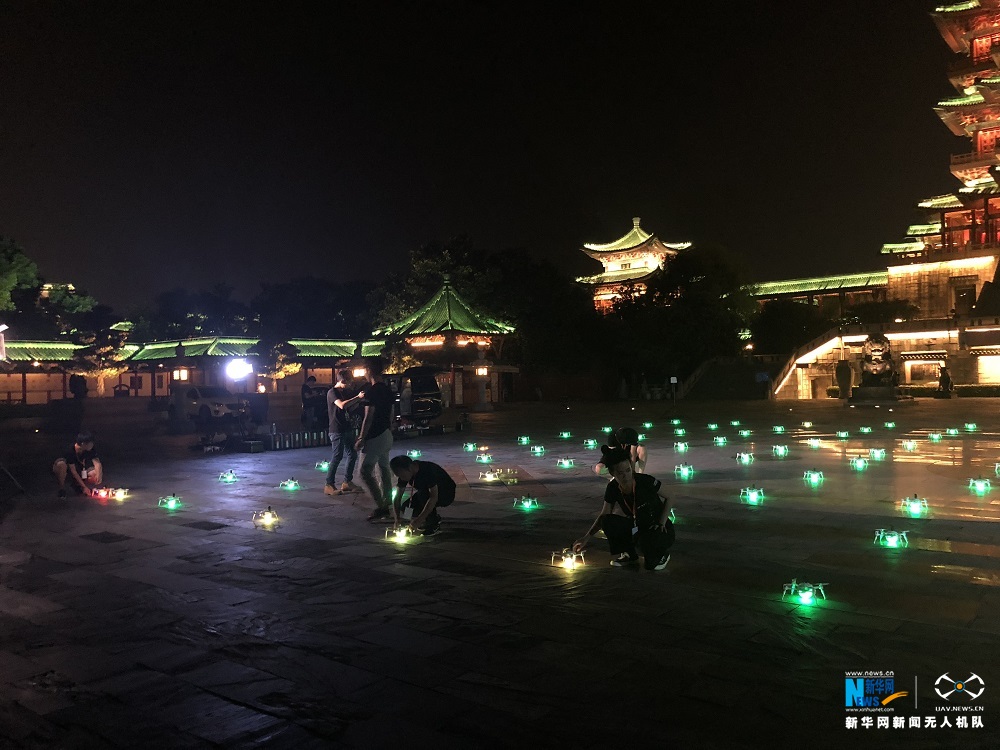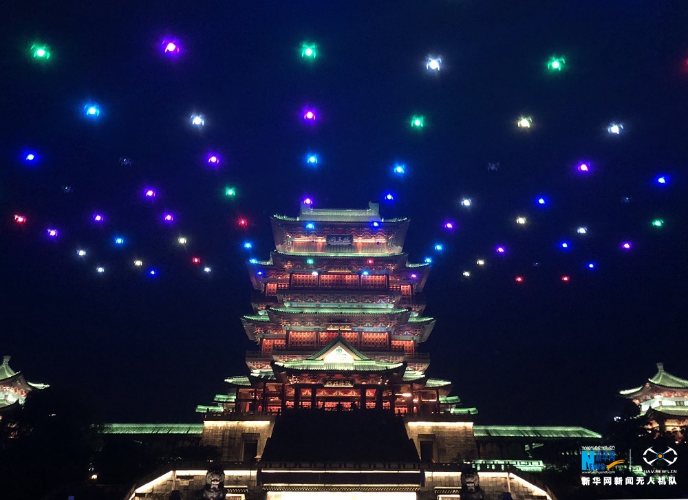9月25日,百架携带LED灯的无人机组成编队,从南昌市滕王阁中心广场上缓缓升起,组成“八一”“I LOVE NC”“南昌”“孤鹜”“崛起”“钻石”等动态字样和3D立体图形,缤纷绚丽如七彩流星,在视觉上呈现出震撼的三维立体效果,突出了南昌城市的动感和科技感。负责无人机编队表演的江西翼眸科技有限公司总经理陆凌岳表示,无人机编队飞行表演的筹备时间共三个月,编队飞行内容图案经过了不断地优化和测试,执行编队表演的无人机都经过特殊改装,机身下携带LED灯,能变化出多重色彩。