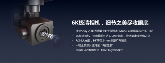 同时,VR6 X支持更先进的H.265编码,最大码流100mps,支持在10bit log色彩模式下录制6K 30fps、4K 60 fps、1080p 120fps的高规格视频。还升级了更先进的动力系统,静音型螺旋桨设计,更高效率电机,续航竟高达40分钟!