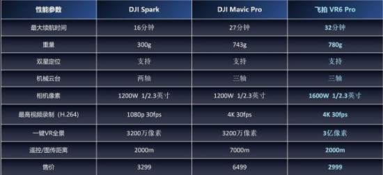 飞拍VR6 PRO 对比大疆Spark、Mavic参数