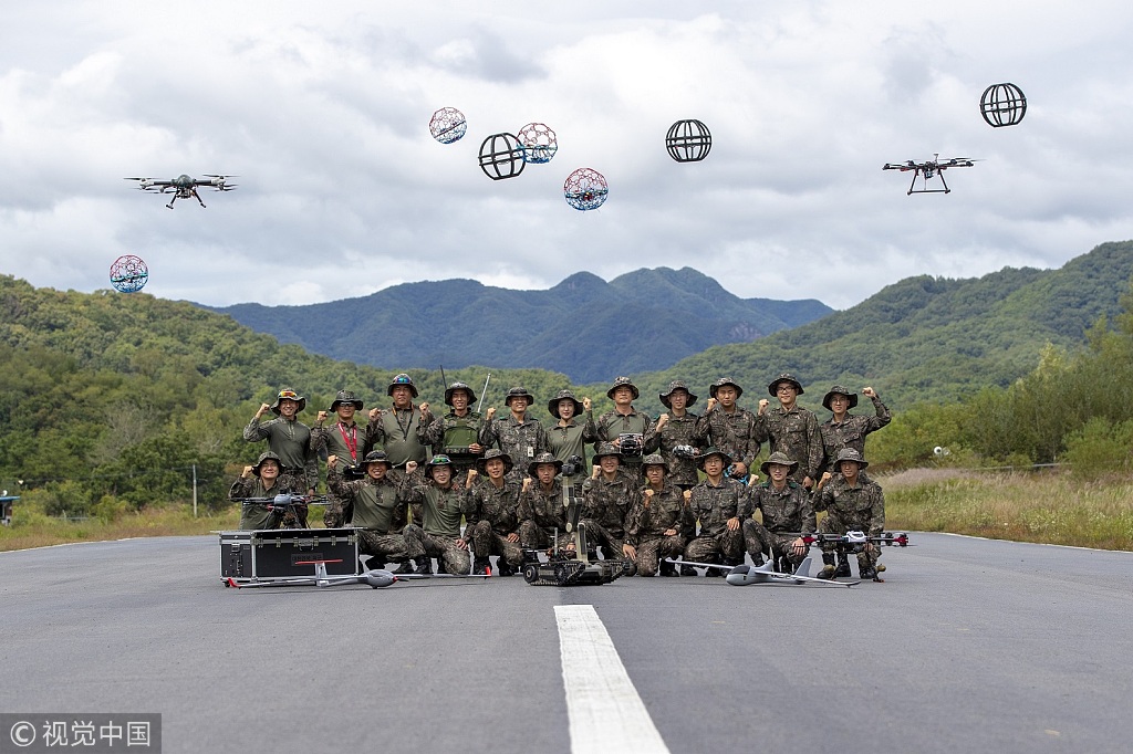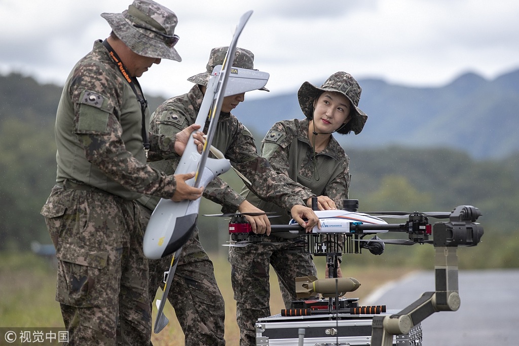 当地时间2018年9月28日,韩国京畿道,韩军士兵在操纵无人机等设备。