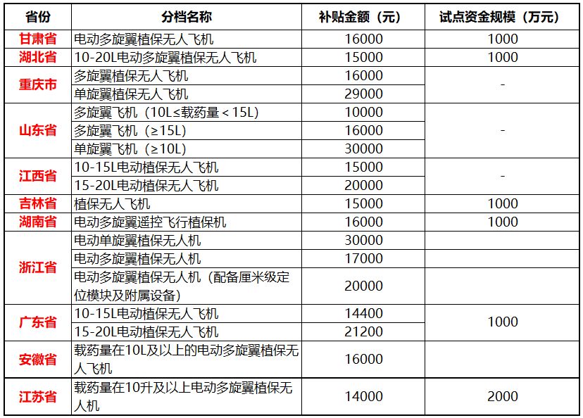 补贴标准:多旋翼飞机(10L≤载药量<15L)10000元/架、多旋翼飞机(载药量≥15L)16000元/架、单旋翼飞机(载药量≥10L)30000元/架。