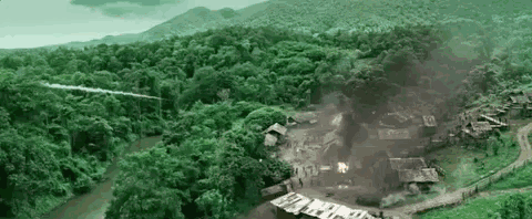 我则是同时控制“悟”2 的云台与精灵 4P,精灵 4P 负责远景,距离拍摄点大约 1 公里远,先是躲在树后面在横向移动看到村庄爆炸,在开始拍摄之前,设置好飞行航点轨迹,然后把精灵 4P 飞到航点起点附近,导演喊 Action 后,请我身边的副导演点击「录制」并且「执行」就可以。
