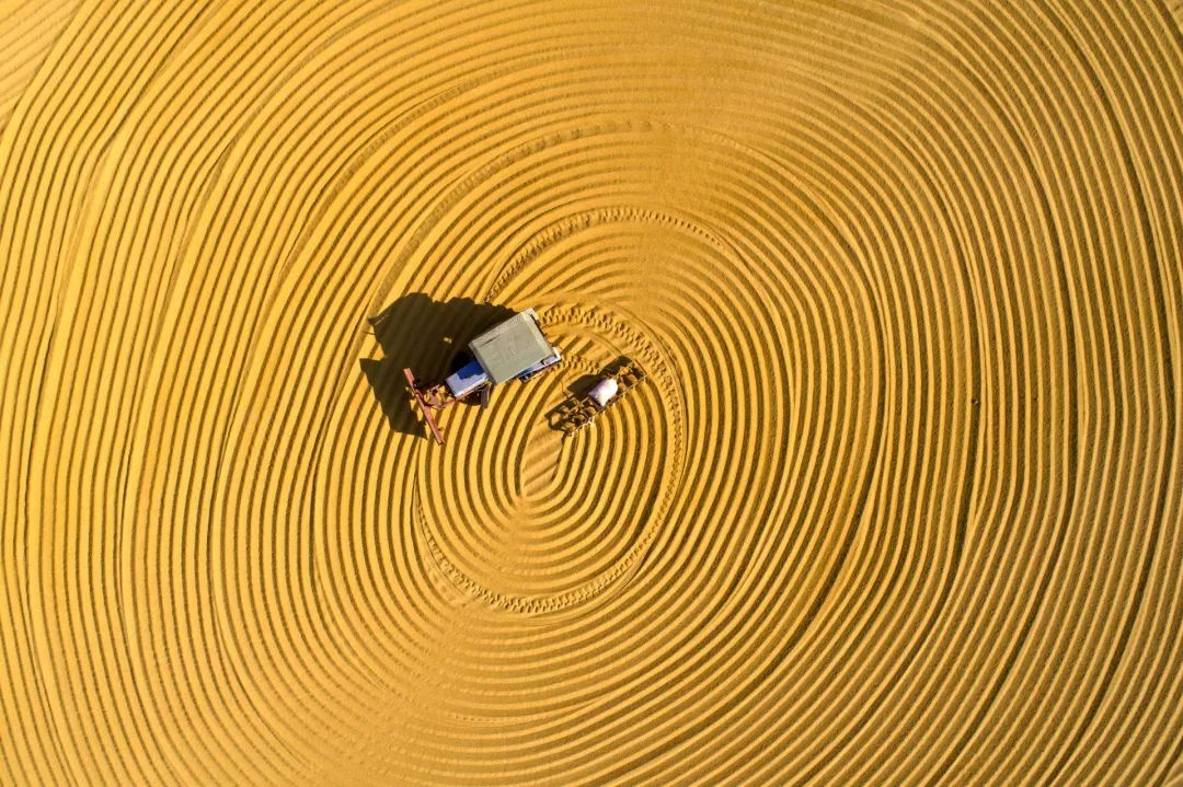 在江苏省淮安市白马湖农场,庞大的农机把谷物均匀地涂抹在大地上,划出一圈圈波纹,秋收是金色的漩涡。