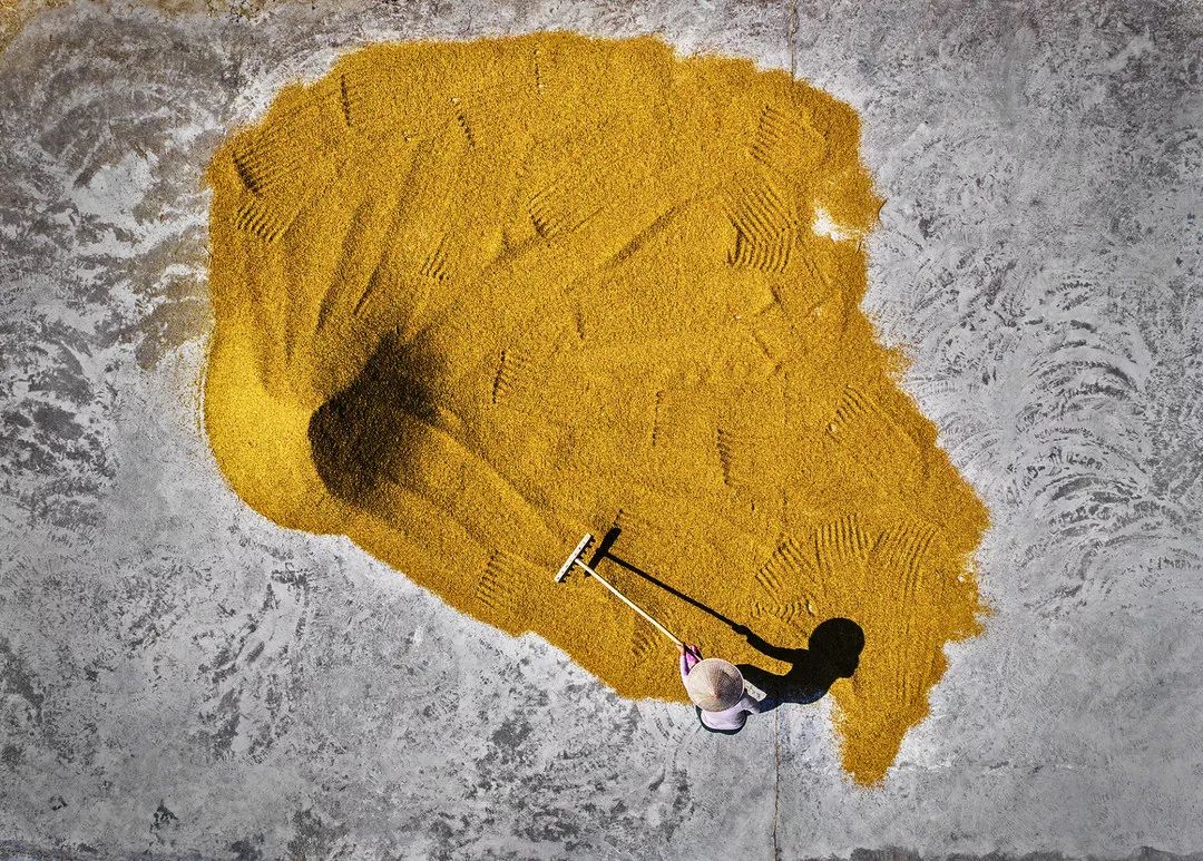 在广西北海市合浦县,晒秋成为当地一道独特的风景。农民把金色的晚稻铺在铅灰色的水泥地上,斑驳的地面像是沉寂的岁月,秋日丰收在每一年的这个时候又给予它新的色彩。