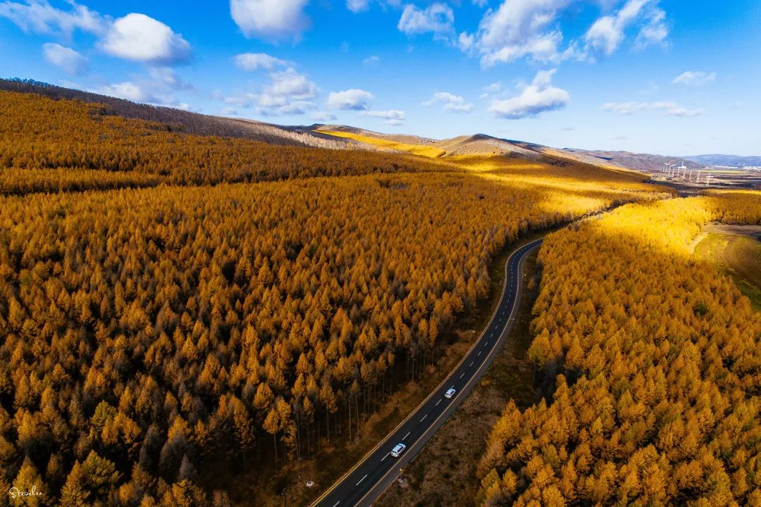 驱车郊外,脱离了城市的灰蒙,此刻的天空蓝得如此欢脱。阿尔山的山林在温煦的阳光下散发出迷人的金色,层层叠叠覆盖在公路的两旁,宛如秋天的迎宾使者。在无人机的视角下,随便一拍都是令人心动的大片。斑斓的山林与秋水,才是这个季节的主色调。