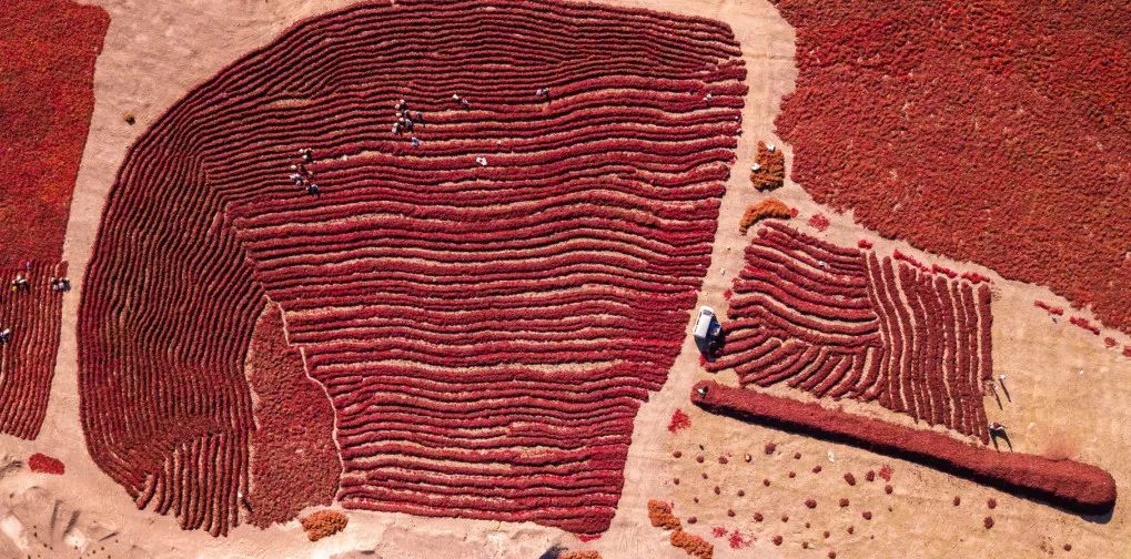 而在新疆焉耆盆地,百万亩红辣角晾晒在田野,秋天是一座座红波荡漾的湖泊。