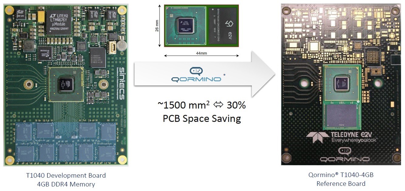 图二:QorIQ T1040微处理器+4GB存储器的参考设计板尺寸对比(来源:Teledyne e2v)