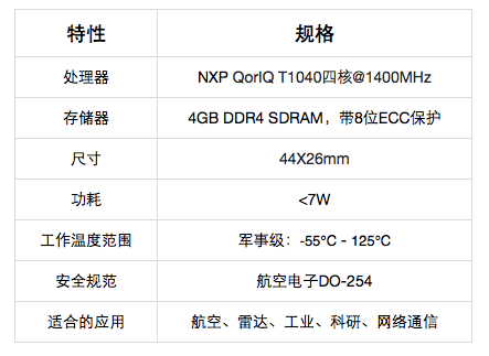 下面我们以Teledyne e2v开发的QorminoQT1040-4GB系统模块为例来说明UAV设计中的SWaP问题是如何被逐一解决的。Qormino是一种小尺寸、低功耗和具强大处理性能的嵌入式计算系统模块,在44X26mm的内插上集成了QorIQ系列微处理器和4GB DDR存储器,特别适合军用和民用无人机的设计开发。Qormino QT1040-4GB系统模块的性能特点如下表所示: