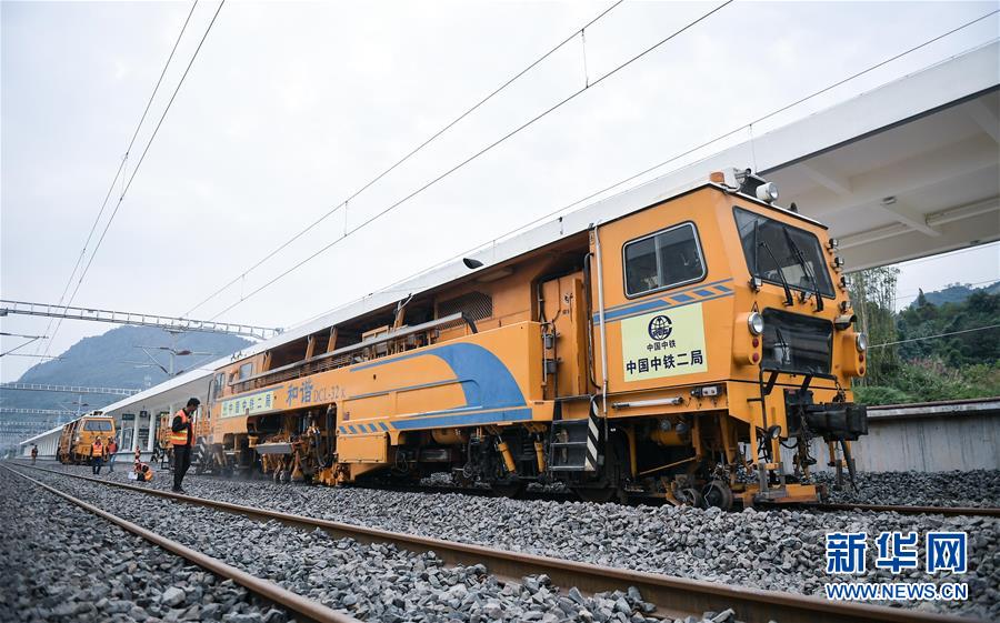 10月11日,中铁二局的施工人员在川藏铁路成雅段雅安站站内进行线路捣固作业。新华社记者薛玉斌摄