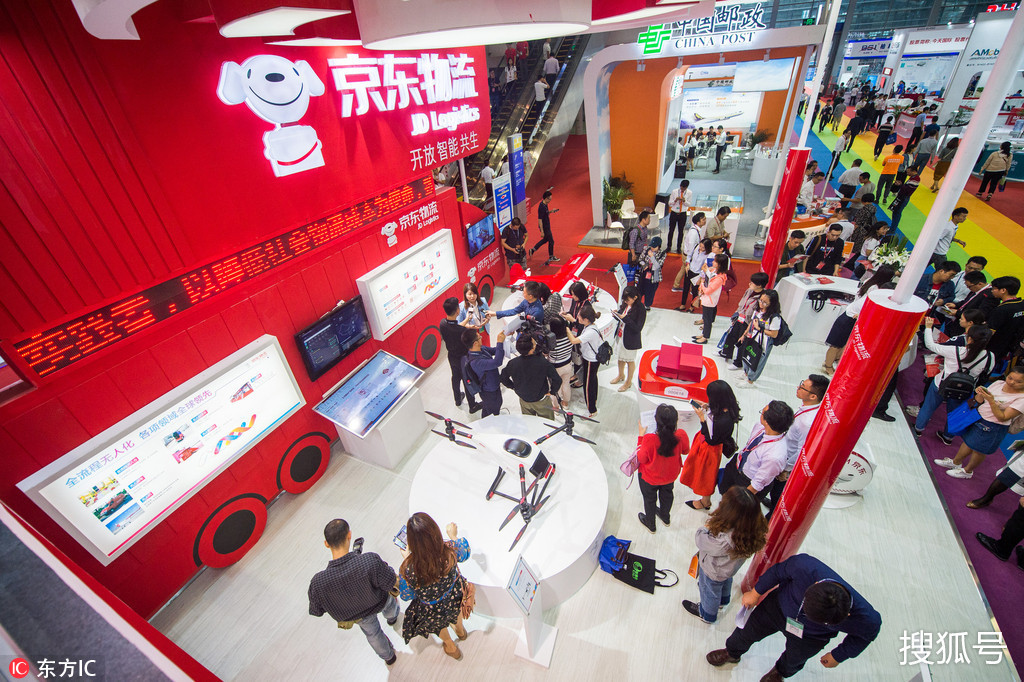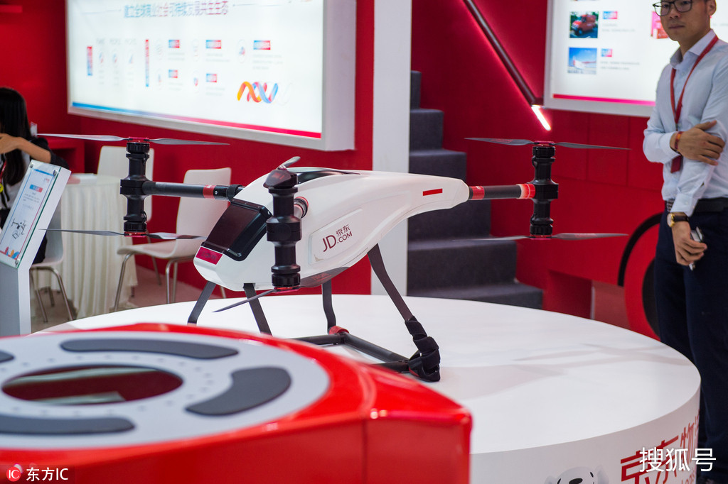 京东物流展区着重展出无人机、物流机器人等设备。