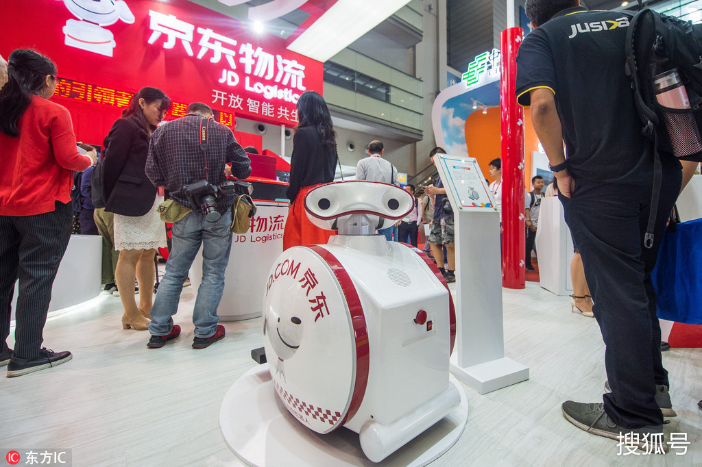 2018年10月11日,广东深圳,第十三届深圳国际物流与交通运输博览会在深圳会展中心举办。本届物博会以“创新驱动,绿色引领”为主题,参展企业将达到1800多家,来自全球50多个国家与地区,通过专业机构一对一买家组织邀约与30多个合作机构联合邀请的VIP采购团预计可吸引超过14万人次的专业观众前来参观。图为京东物流展区展出的机器人。