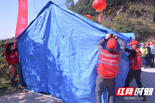 伴随着山体滑坡的模拟“隆隆”声,青山新村社区立即启动防灾抢险应急预案, 6个应急救援小组紧急成立并开展救援。其中,紧急疏散组迅速组织饭庄居民,疏散受困群众,重点援助老人、孕妇、儿童等人等前往应急避难场所安置;医疗救护组针对不同病情的患者,第一时间开展急救处理;交通保障组调集挖掘机,及时清理修复路段。社区减灾志愿服务队也组成救援队开展应急救援。在演练现场的灾民集中安置处,来自长沙市民众应急服务中心的6名志愿者,仅用不到4分钟,就在现场快速搭建起一座面积12平方米的救灾单帐篷。