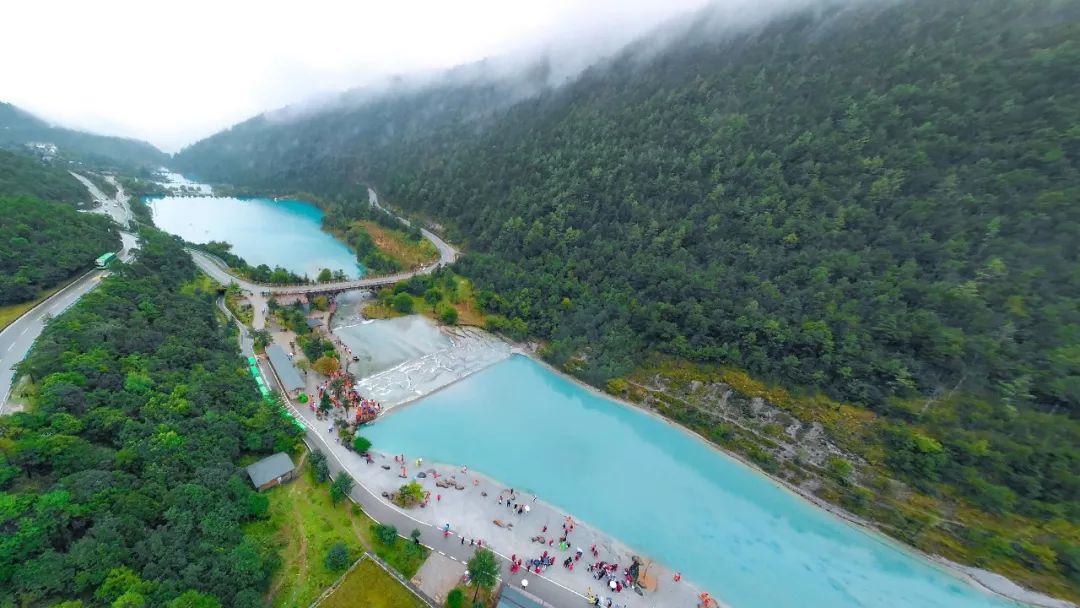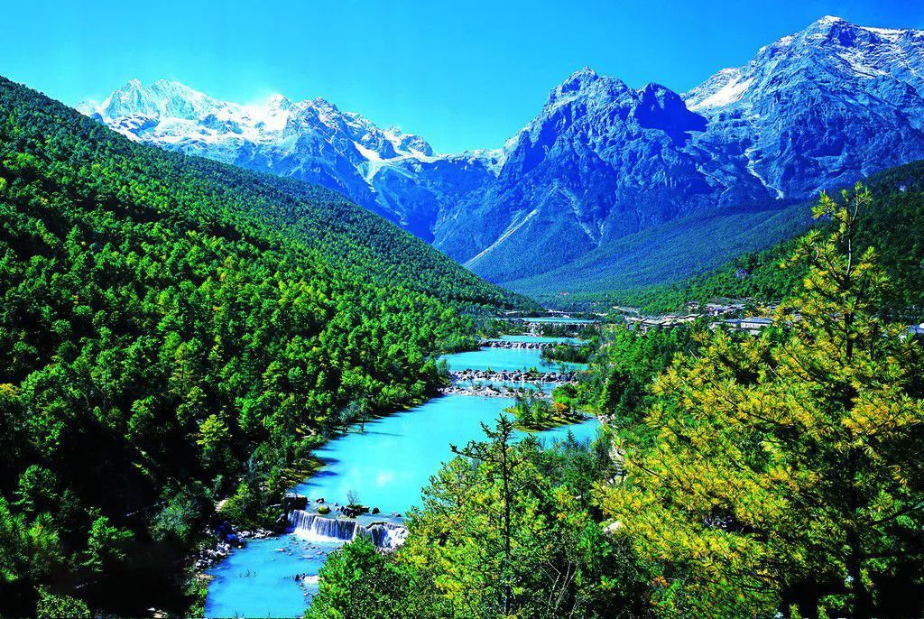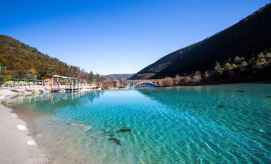 玉龙雪山东麓甘海子以北、云杉坪南侧的山谷之中。万古冰雪消融之后顺着峭壁流淌而下,最终在深谷之中形成了清澈甘冽无比的河流。