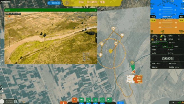 飞机起飞后,在目标搜索区域盘旋待命,控制吊舱改变视角并未发现目标,无法得知目标具体位置的情况下,AheadX智能搜索模式开始大显身手。