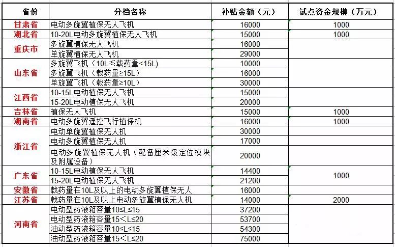 补贴标准:电动单旋翼植保无人机30000元/架、电动多旋翼植保无人机17000元/架、电动多旋翼植保无人机(配备厘米级定位模块及附属设备)20000元/架。