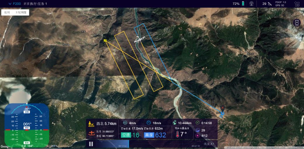 2018年10月12日下午16:40,四川省测绘应急保障中心无人机分队在距离滑坡体5公里处选定起降场地并起飞飞马智能航测系统F200,17:15,F200安全降落,完成有效面积5.5km²的平均分辨率15cm高分辨率影像获取。
