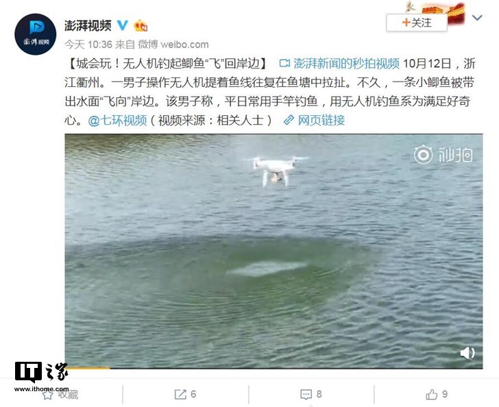 IT之家10月13日消息 无人机不仅可以用来拍照,还可以钓鱼!据澎湃新闻报道,10月12日,浙江衢州一男子就操作无人机成功在鱼塘里钓上鱼来。