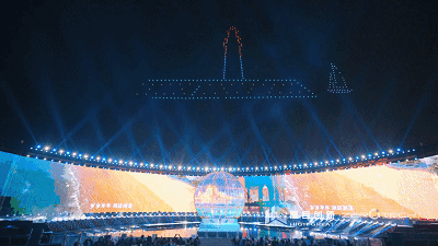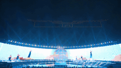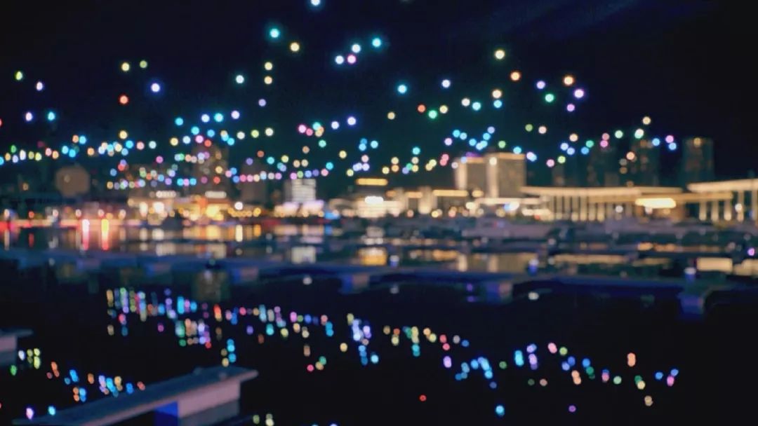 舞台的搭建全在海面上完成,在全世界都少有先例,创造性地将华灯璀璨的城市夜景融入舞台表演当中。而空中舞动的无人机编队,更是星芒跃动,绽放着整座城市的骄傲与自豪。