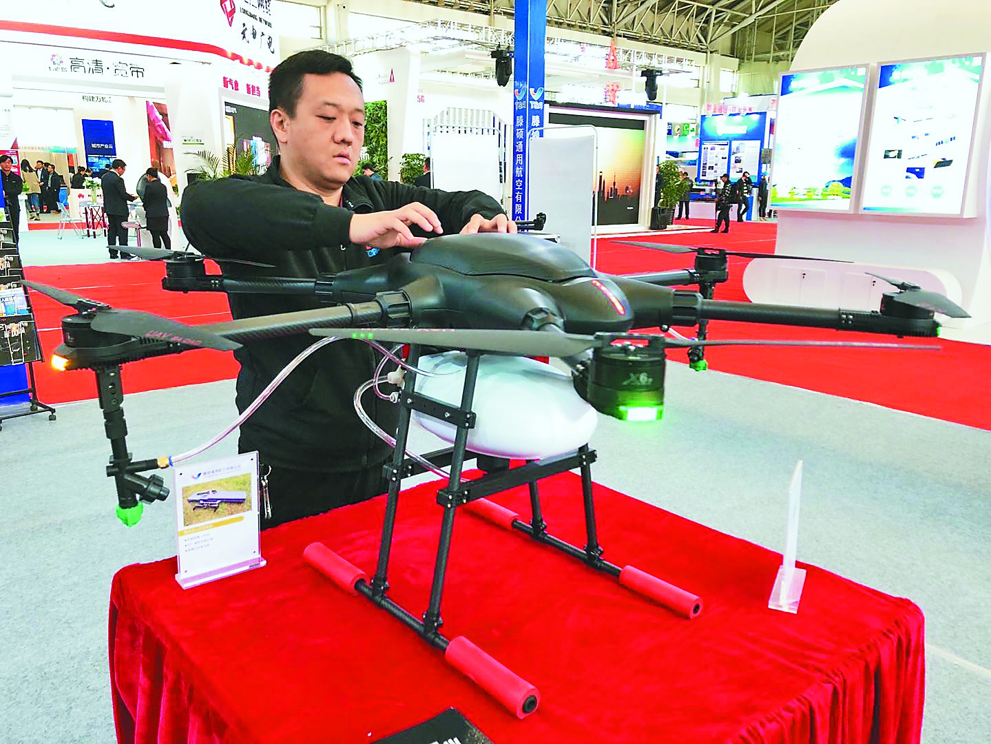 工作人员展示“霸稻”农用植保无人机。记者刘莉摄