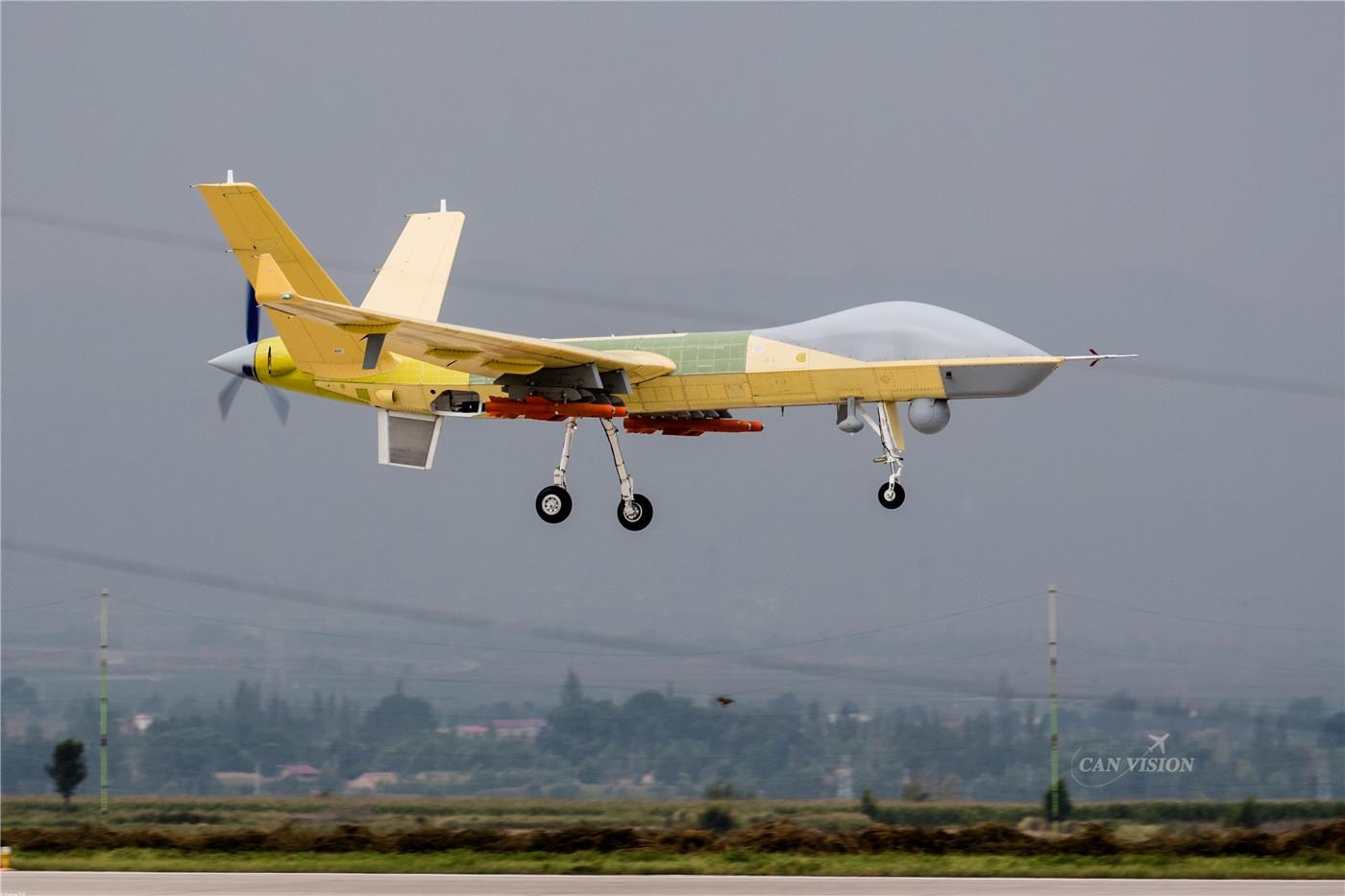 图片:起降中的翼龙II,翼下红色导弹应该是AG-300