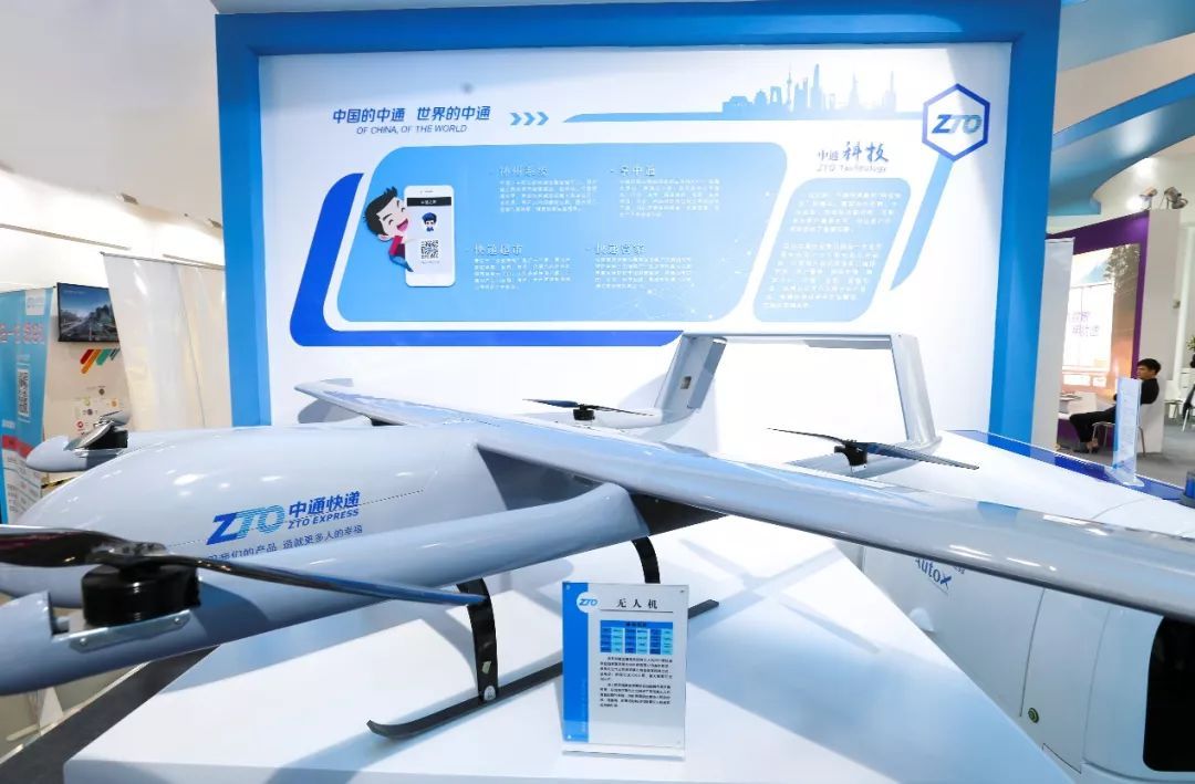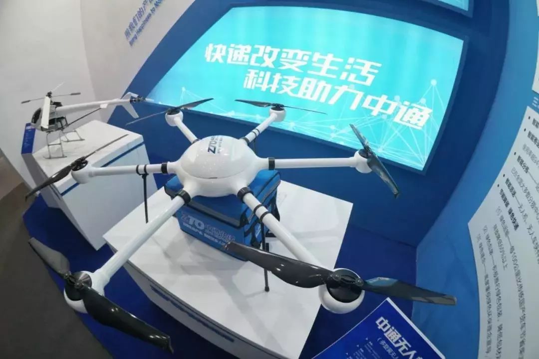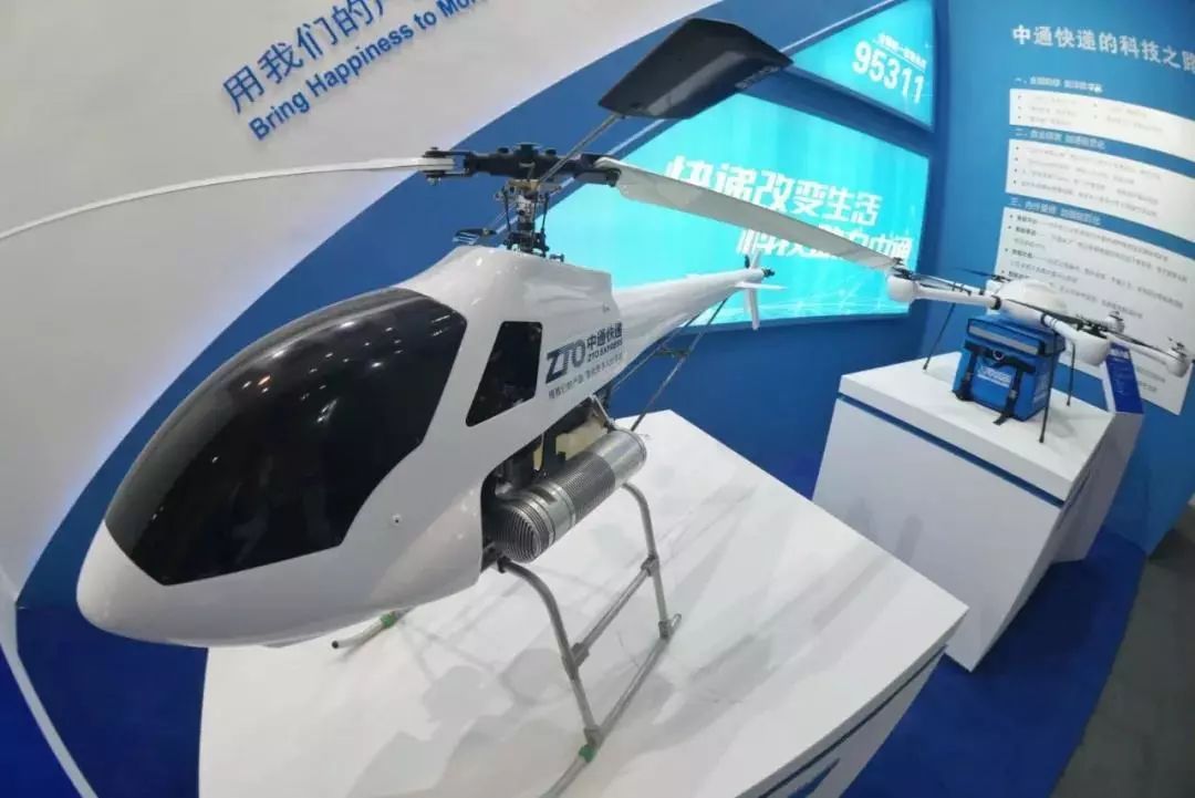 在快递物流装备暨物料采购博览会上,中通共展示两款无人机,一款为直升无人机,一款为多旋翼无人机。直升无人机最大有效载荷为11.5kg,续航时间可达65分钟,最快飞行速度为80km/h。