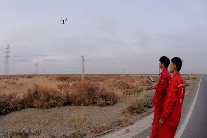 图为:10月16日,西北油田工程服务中心水电管理部瓦克夏综合班用无人机对110千伏001号至0813杆塔进行通道巡视。