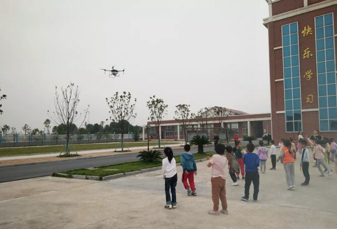 讲座结束后,标普农业工作人员与学生进行的“自由鹰1S实操环节”,更是将整场活动推向了高潮。自由鹰1S经过升级和优化,外形更炫酷、操作更简单,“叔叔,这无人机是怎样做出来的?” 孩子们兴趣盎然,体验着无人机带来的喜悦。“以前在电视上看过会飞的无人机,现在我自己也可以拿着遥控飞了”五年级的王瑞小朋友这样说。随着一阵机器的轰鸣声,自由鹰盘旋在上空,现场的同学发出了一阵阵惊叹声。