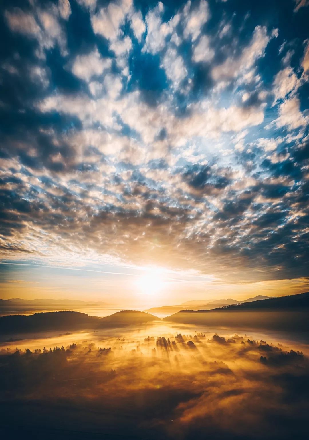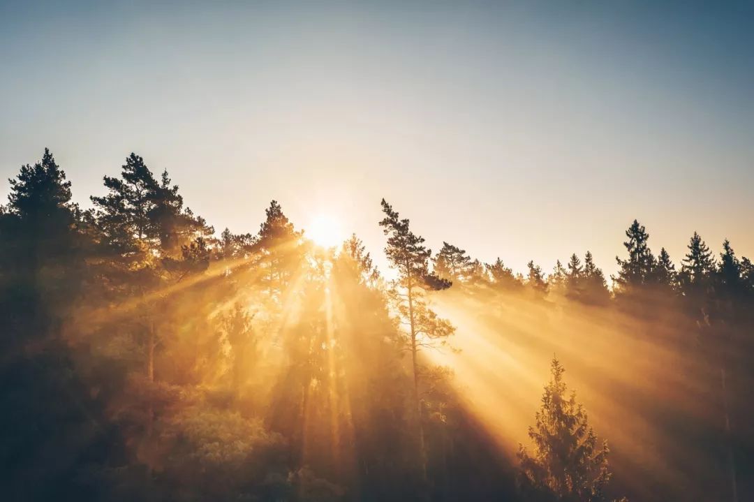 日出的光辉四溢与绚丽多彩,总是要亲眼目睹,才能体会一二。山峦间的晨雾变成了光最好的导体,一片片洒在树林上。此刻的初阳是利剑,刺破天帷的云层,把大地分割成蔚蓝色的幻境和金色的海洋。